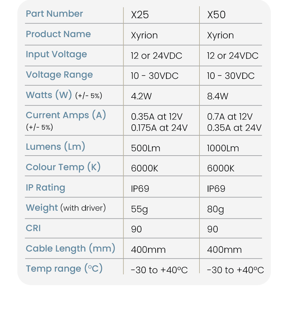 An ultra-low-profile light bar built around our Photonix™ LED array and packaged in a sleek 7mm polycarbonate tube. Available in 270mm and 520mm lengths, Xyrion delivers smooth, glare-free illumination in a compact form factor that fits where other lights cannot be installed.